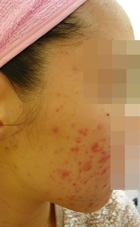 양볼에 생긴 화농성 여드름 치료 사진입니다.