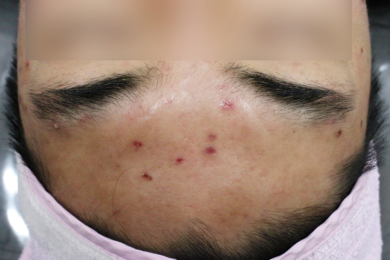 트랜스테라피 시술을 받으신 흉터는 6군데 빨간색 동그라미로 표시를 해두었습니다. 그 외의 흉터들은 트랜스테라피 없이 엠톤과 미세약초침 시술만으로도 호전되었으며, 특히 파란색 네모박스의 흉터들은 생각보다 큰 흉터도 포함되어있는데, 트랜스테라피 시술없이 호전된 모습을 보여줍니다. 결론적으로 깊고 큰 흉터들은 트랜스테라피(새살침) 시술이 필요합니다만, 다만 작고 깊지 않은 흉터들은 엠톤 및 미세약초침 시술을 받으시는 것이 더 나은 경우도 많이 있기 때문에, 여러 가지 흉터가 다양하게 혼재해있는 분이시라면 트랜스테라피와 엠톤 및 미세약초침을 병행하는 복합시술을 추천드립니다.