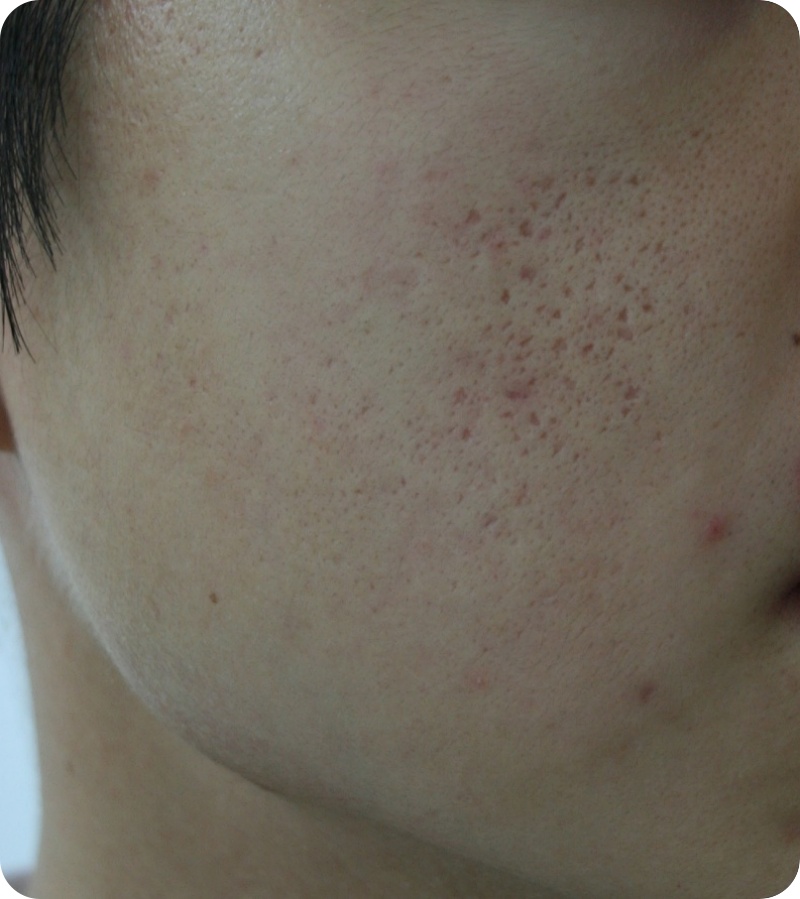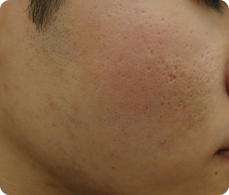 다양한 여드름 흉터가 존재 한다. 그중 흉터의 직경에 비해 깊이가 깊어 마치 얼음송곳으로 찍은듯한 흉터를 아이스픽형 흉터라고 분류해왔다. 아이스픽형 흉터는 좁고 깊기 때문에 크고 깊은 흉터에 비해 아주 정교한 스킬이 필요하다. 또 이런 형태적인 분류는 아이스픽형 흉터가 생기는 과정이나 피부의 특성을 고려하지 않고 현재의 흉터의 모양만으로 한 분류이기 때문에 피부의 두께와 피지선의 존재 유무 같은 조건을 고려하지 않고 치료를 하였을때 효과가 차이가 난다. 따라서 아이스픽형 흉터를 세부화 하고 각각의 치료방법을 나누는것이 더 좋을 효과를 낼수 있다 할수 있다. 아이스픽 형 흉터 TYPE 1) 모공이 벌어지지 않으며 피부 두께가 정상적인 아이스픽 형 흉터 이런 경우 흉터의 모양을 잡고있는 섬유성 연결이 강하기 때문에 미세이식술이 트랜스테라피와 동시에 피비테라피를 하는것이 좋다. *흉터의 모양을 유지하려고 하는 섬유성 연결: 예를 들면 섬유질으로 되어 있는 텐트는 그 형태를 유지하는 줄과 폴대에 의해 일정한 형태를 유지한다. 이 형태를 깨기 위해서는 연결된 줄과 폴태를 해체 해야 원래 형태를 잃는다. 마찬가지로 흉터 눌렀다가 다시 손을 떼면 원래 형태로 돌아간다. 흉터 역시 아주 미세한 섬유성 연결로 그 형태를 유지하려고 한다. 이 연결을 정확하게 끊어야만 흉터가 차오르는 효과를 기대할수 있다.