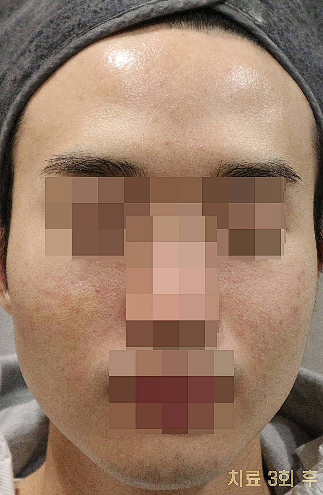 치료 3회 진행 후 피부염이 호전되면서 안면 전체의 붉은기가 가라앉았고 모낭염 개수도 감소를 보였습니다.
