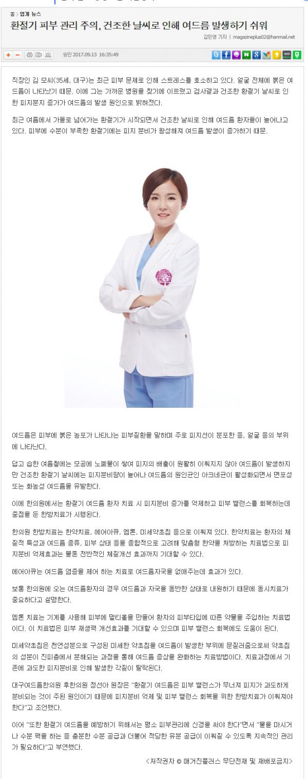 후한의원 광주점 : 여름철 증가하는 피지분비, 모공 막아 여드름 등 피부트러블 유발해