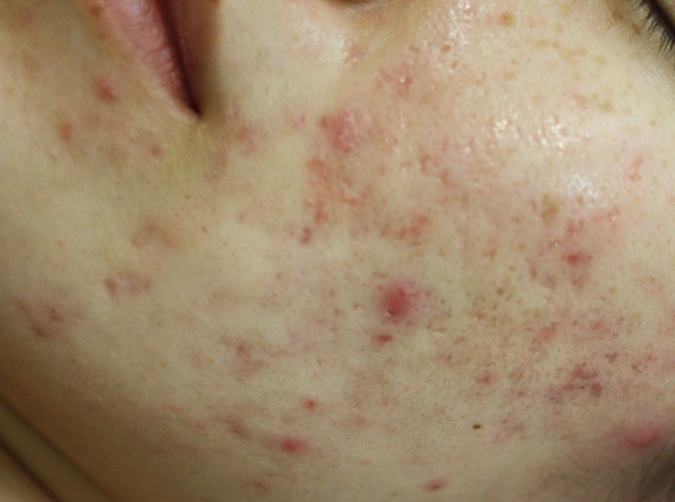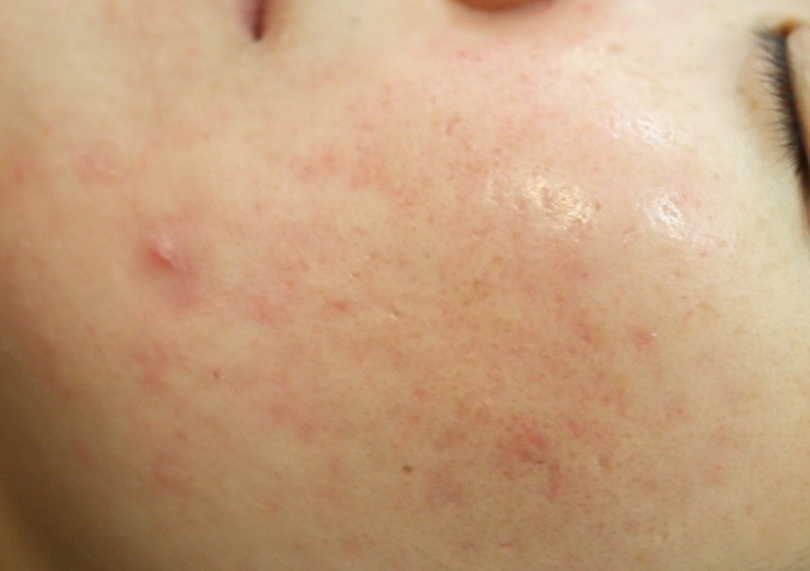 20대 후반 여성. 여드름과 여드름 흉터가 있어서