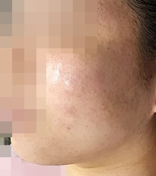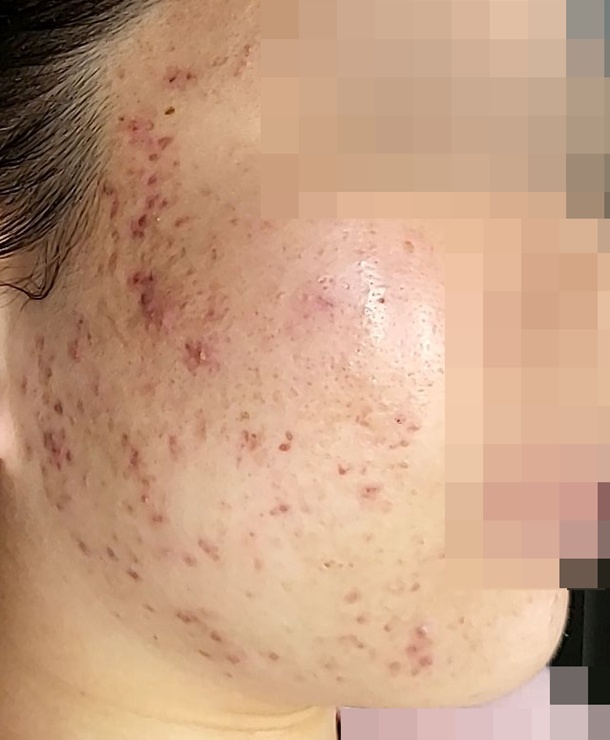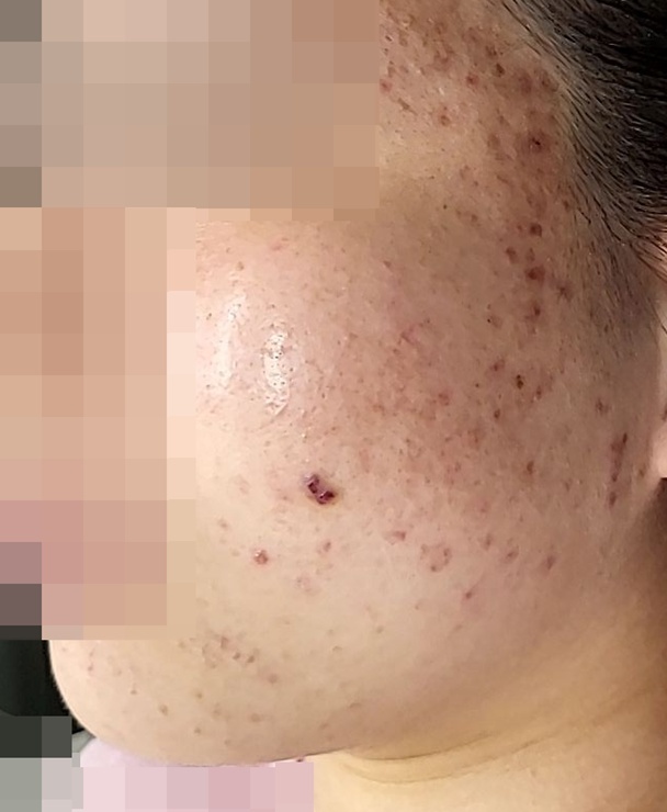 양볼에 생긴 검붉은 여드름 자국 치료 사진입니다.