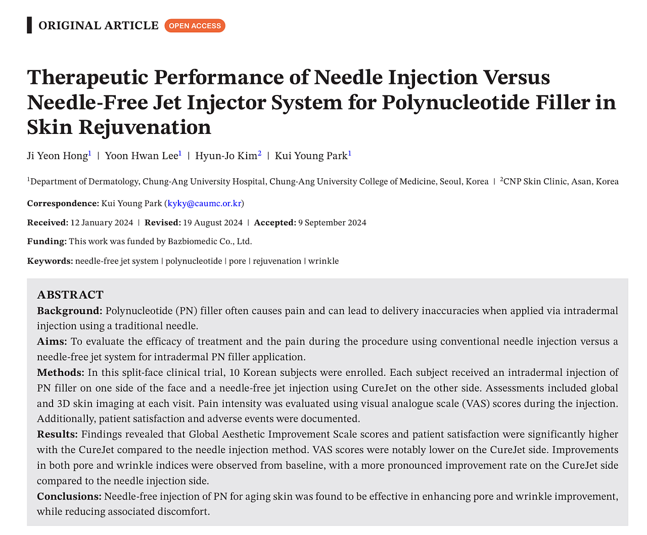 2024.10.11~2025.06.13 여드름 흉터 치료에서 서브시전(subcision)이나, 잔주름·탄력 개선을 위한 스킨부스터 주사를 생각하면 많은 분들이 먼저 떠올리는 건 ‘바늘’과 ‘통증’입니다. 그래서 최근 몇 년 사이에 바늘 없이 약물을 피부에 전달하는 ‘needle-free jet injector(제트 인젝터)’가 큰 관심을 받고 있습니다. 대표적으로 큐어젯, 미라젯 등의 기계가 여기에 해당하는데, 이 장비들이 어떤 장점과 한계를 갖는지 의학 논문을 근거로 리뷰해보려 합니다.